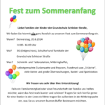Das Team von Socius lädt alle Kinder und Eltern zu einem Sommerfest am 20.06.2024 ein. Für Spaß und Spiel ist gesorgt, für das Mitbring-Buffet freuen wir uns sehr über weitere Unterstützung. Melden Sie sich mit ihren Fragen unter 0151 11 47 44 55 bei unserer Ganztags-Leiterin Frau Lemzer.